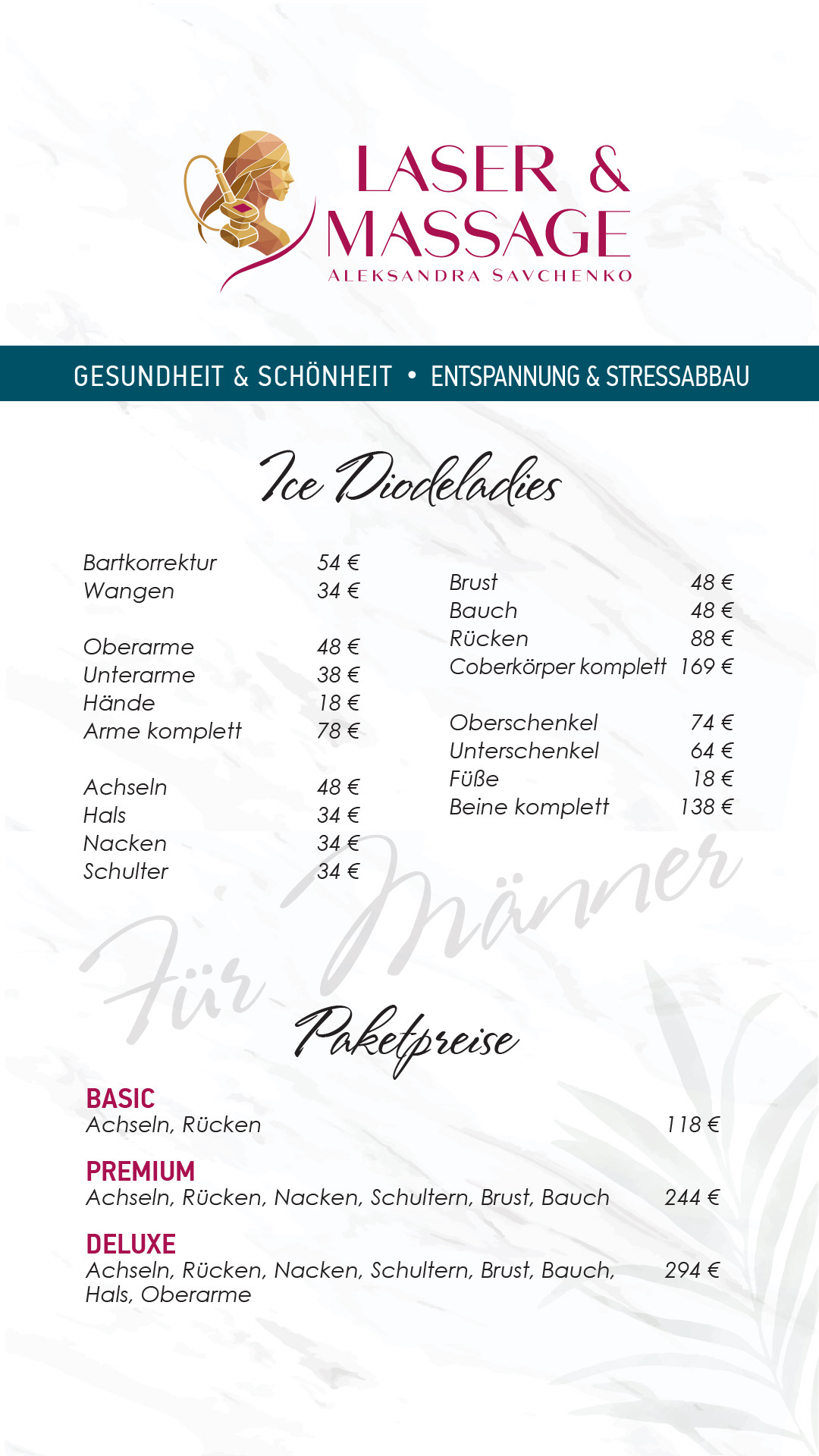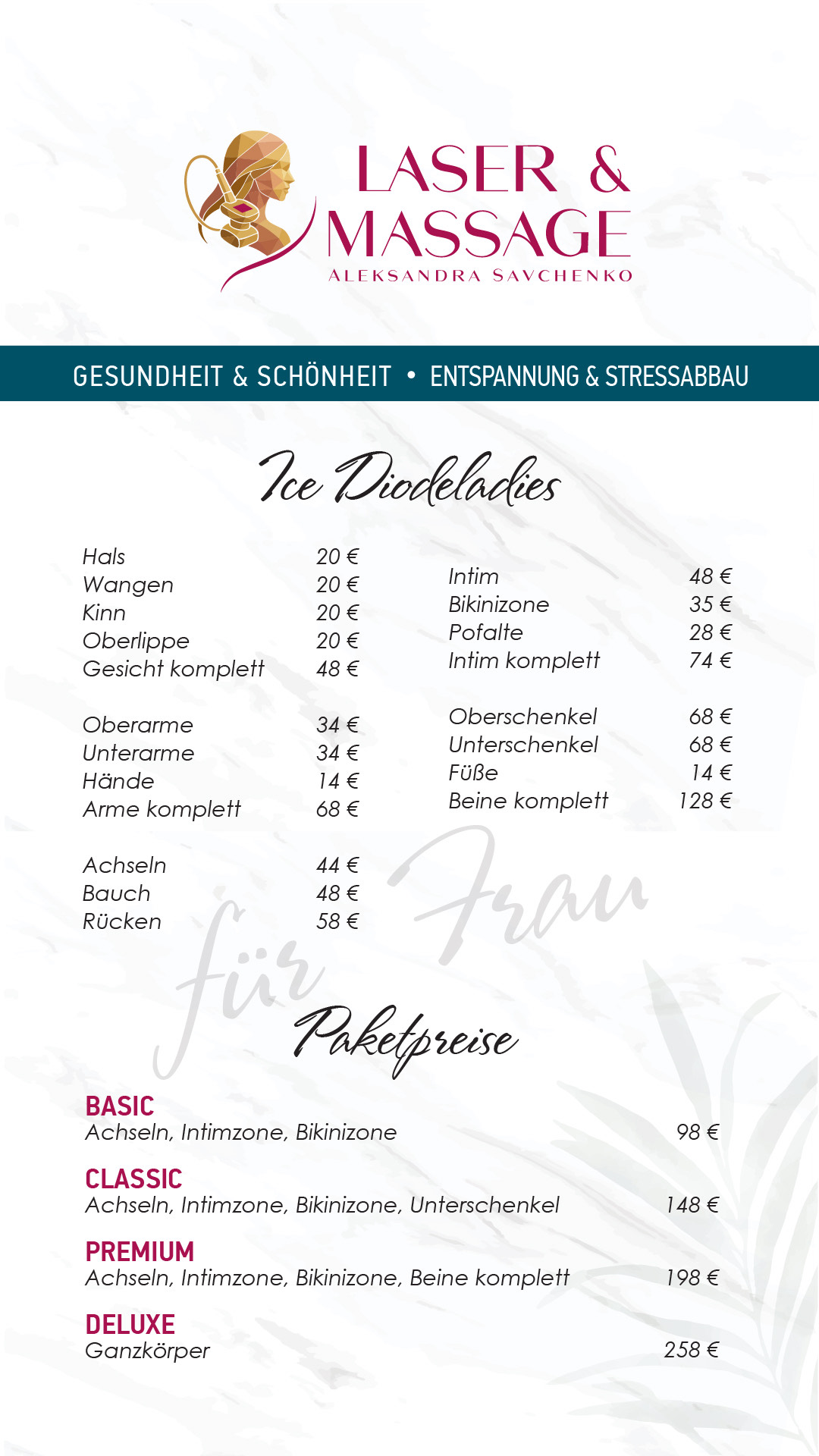 Unsere Diodenlaser-Technologie gehört zu den fortschrittlichsten und effektivsten Methoden zur dauerhaften Haarentfernung. Dank ihrer präzisen Wellenlänge dringt sie gezielt in die Haarfollikel ein, ohne die umliegende Haut zu beeinträchtigen. So genießen Sie eine sanfte, schonende und gleichzeitig gründliche Behandlung.